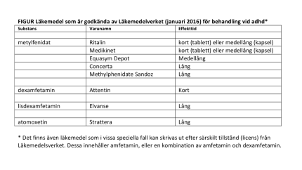 Metylfenidat, dexamfetamin, lisdexamfetamin och atomoxetin. Så heter de fyra olika substanser som i dagsläget är godkända av Läkemedelsverket för adhd-behandling i Sverige.